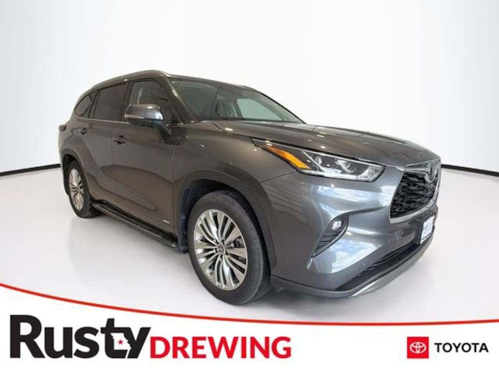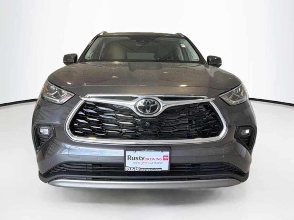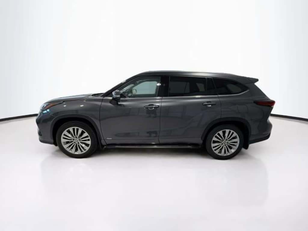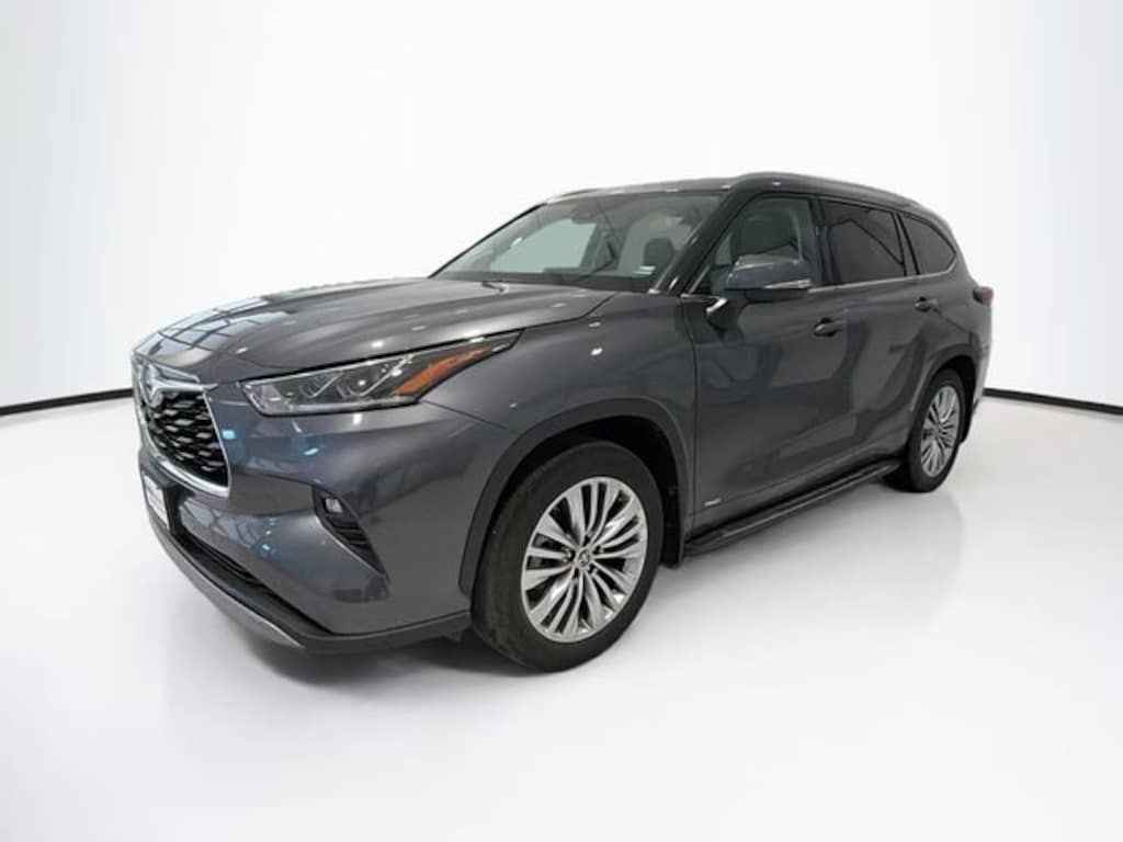 CARFAX One-Owner. Magnetic Gray 2025 Toyota Highlander Hybrid Platinum AWD eCVT 2.5L I4 PDI Hybrid DOHC 16V LEV3-SULEV30 Highlander Hybrid Platinum, 4D Sport Utility, 2.5L I4 PDI Hybrid DOHC 16V LEV3-SULEV30, eCVT, AWD, Magnetic Gray, Black Leather, 20" Alloy Wheels, 3rd row seats: split-bench, Apple CarPlay/Android Auto, Electronic Inner Mirror, Exterior Parking Camera Rear, Front dual zone A/C, Heads-Up Display, Heated and Ventilated Front Bucket Seats, Heated front seats, Heated rear seats, Heated steering wheel, High Grade LED, Navigation system: Drive Connect Cloud Navigation (1-year trial subscription), Panoramic Sunroof and Moonroof, Panoramic View Monitor, Platinum Package, Power Liftgate, Radio: 12.3" Toyota Audio Multimedia with JBL Premium Audio, Reclining 3rd row seat, Running Boards, Speed control, Ventilated front seats.